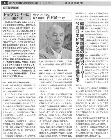 【メディア掲載】「健康産業新聞」に弊社代表のインタビュー記事が掲載されました。 投稿日 2021年9月22日 更新日 2025年10月14日 著者 admin カテゴリー お知らせ この度、健康産業新聞1724号(2021年9月15日発売) にて「トップランナーに聞く」と題し大阪府の健康美容産業の注目企業としてインタビュー記事を掲載いただきました(26頁目)。コロナ禍での経営、今後の展望などについてコメントしておりますので、ぜひご一読くださいませ。 健康産業新聞より、弊社代表を取り上げて頂けたこと、大変光栄に存じます。トラストレックスはこれからもお客様に安心して弊社商品をご利用いただけるよう邁進して参ります。