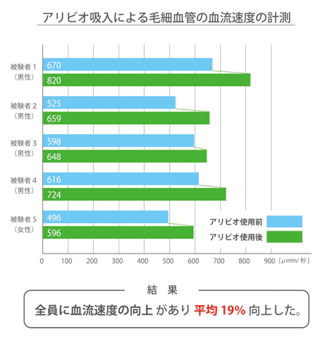 5名の被験者の安静時とalivioHガス30分吸入後、左手薬指の毛細血管の血流速度を比較測定結果は、最低が8%、最高が26%で、全員の血流速度が向上、平均19%の向上が見られました。