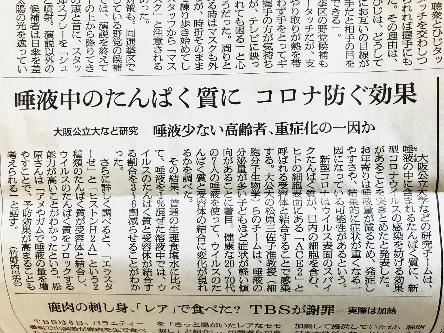 【朝日新聞:唾液中のたんぱく質にコロナ防ぐ効果 唾液少ない高齢者、重症化の一因か】