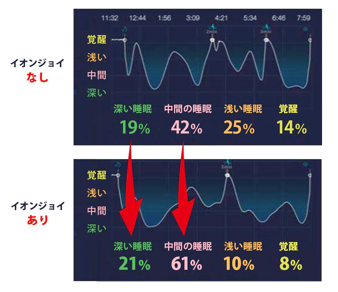 『ノンレム睡眠』とは脳も体もぐっすり眠っている状態であり、睡眠の質を高めるカギは『ノンレム睡眠』にあります。マイナスイオンで副交感神経の働きを高めリラックス状態にしたことで、深い睡眠が得られました。