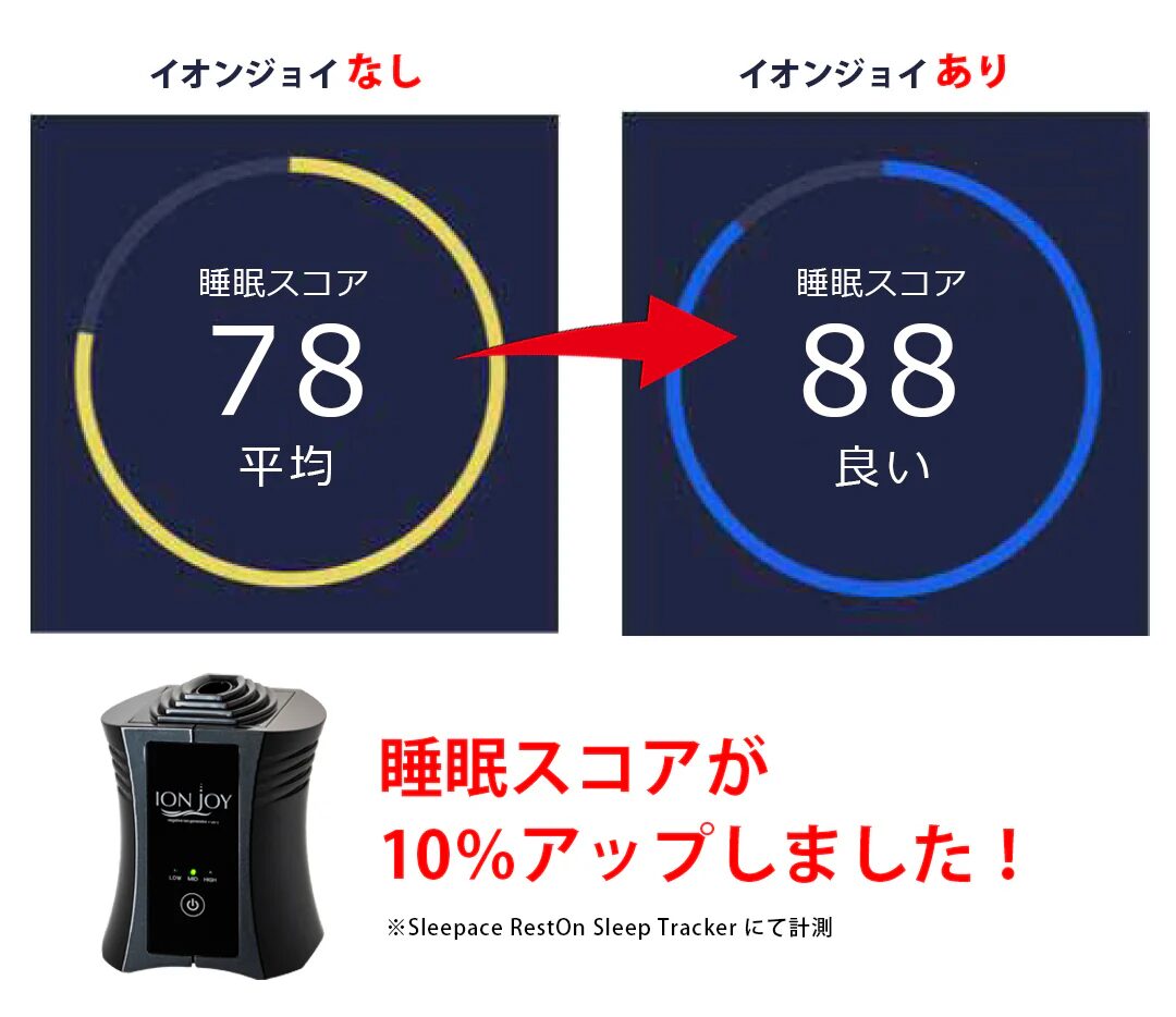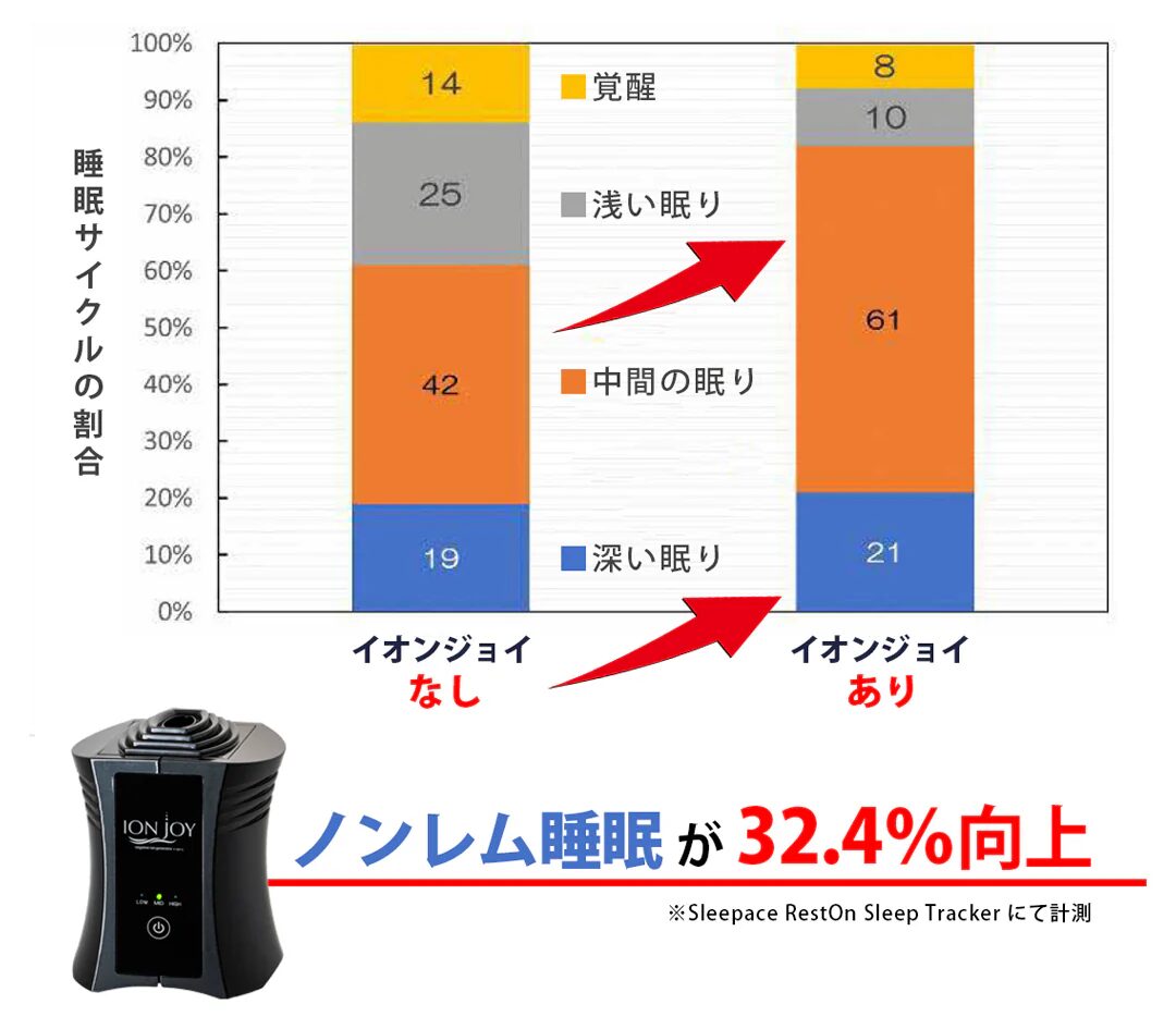 2022年6月30日、卓上型マイナスイオン発生器「イオンジョイ」を使い「睡眠の質試験」を健康コントロール研究会にて行った結果、イオンジョイを使用していない時と比べて、『ノンレム睡眠』が32.4%向上したという効果が見られました。